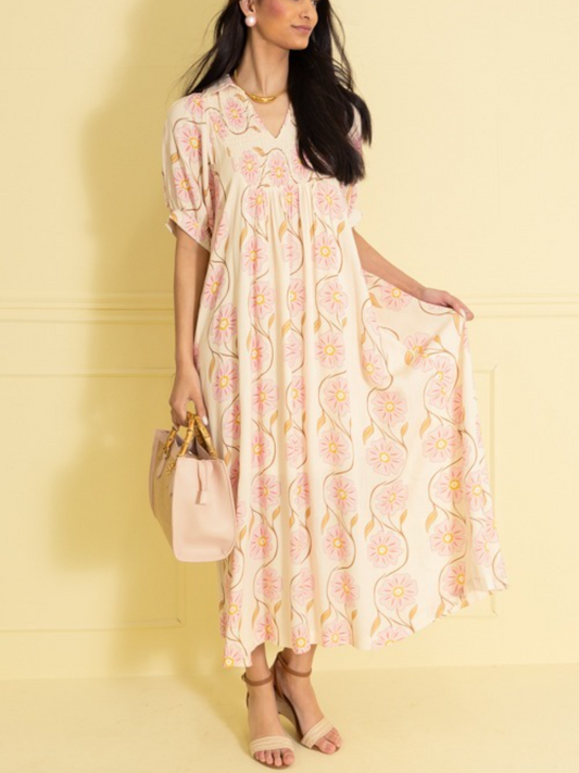 Cream Pink Daisy Print Puff Sleeve Maxi Dress