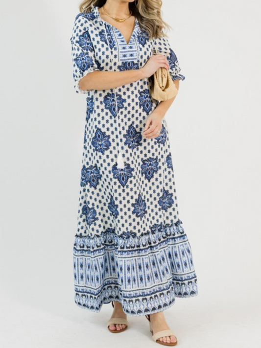 Blue White Boho Print Tiered Maxi Dress