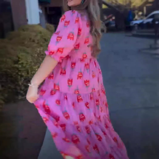 Printed V-neck Puff Sleeve Dress