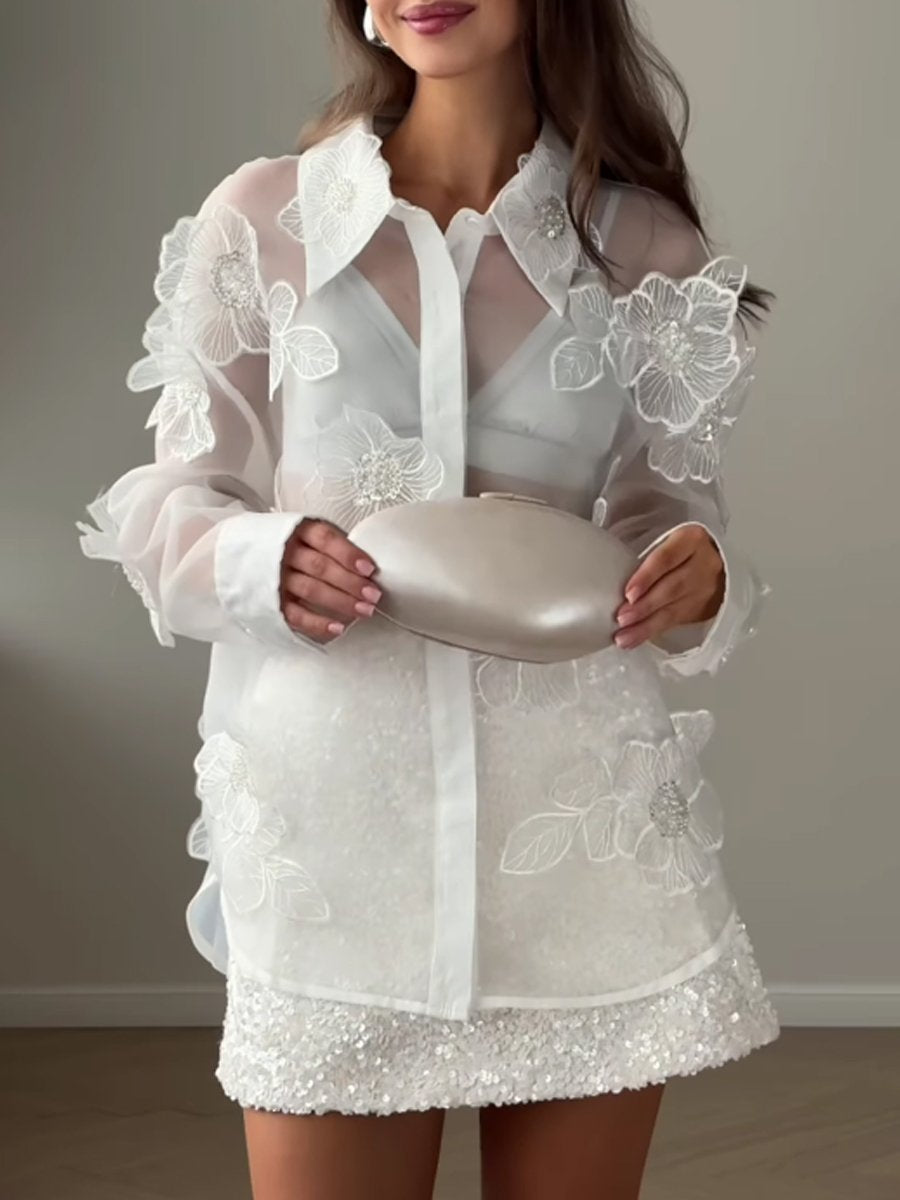Beaded 3D Flower See-through Shirt