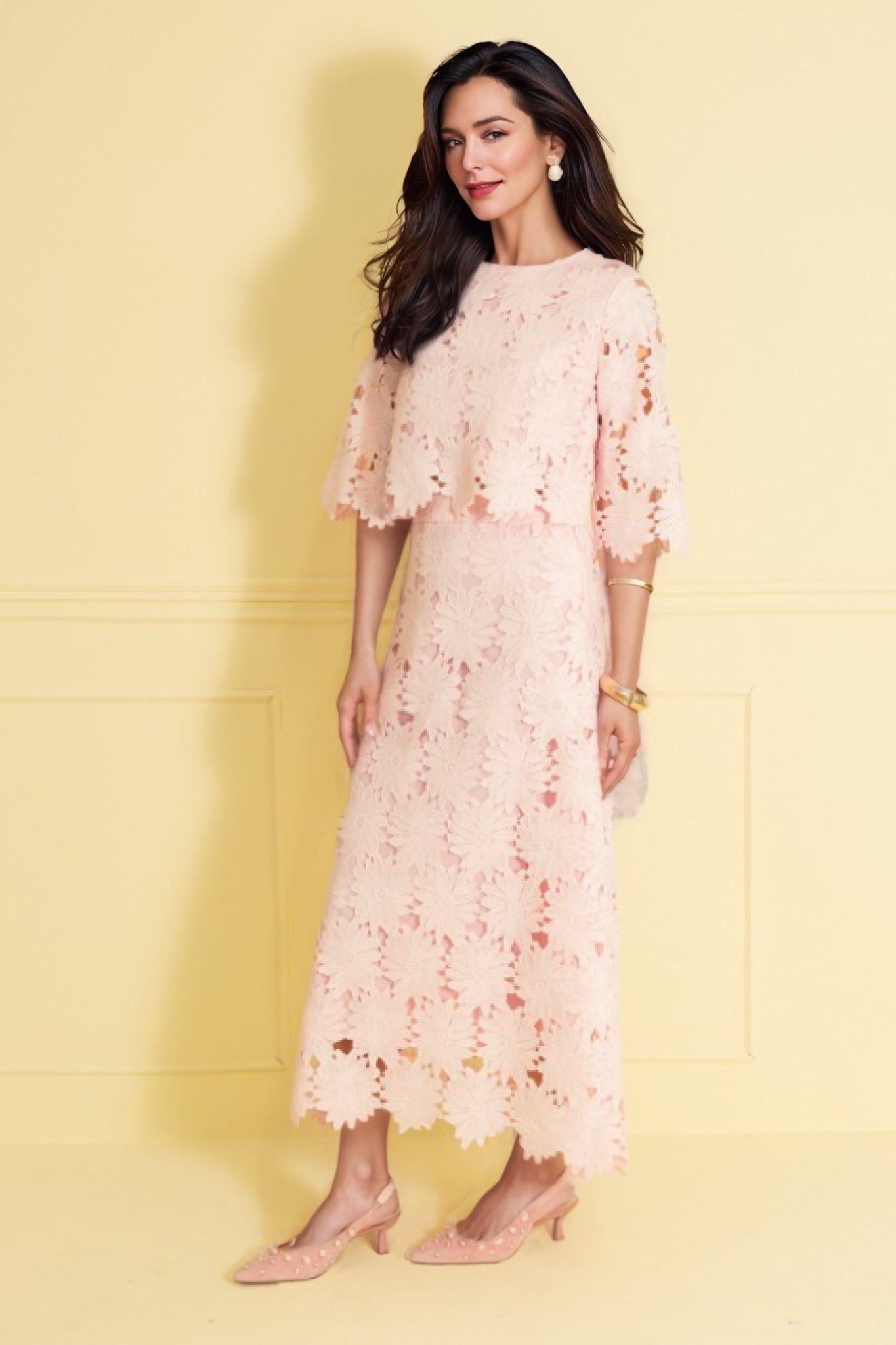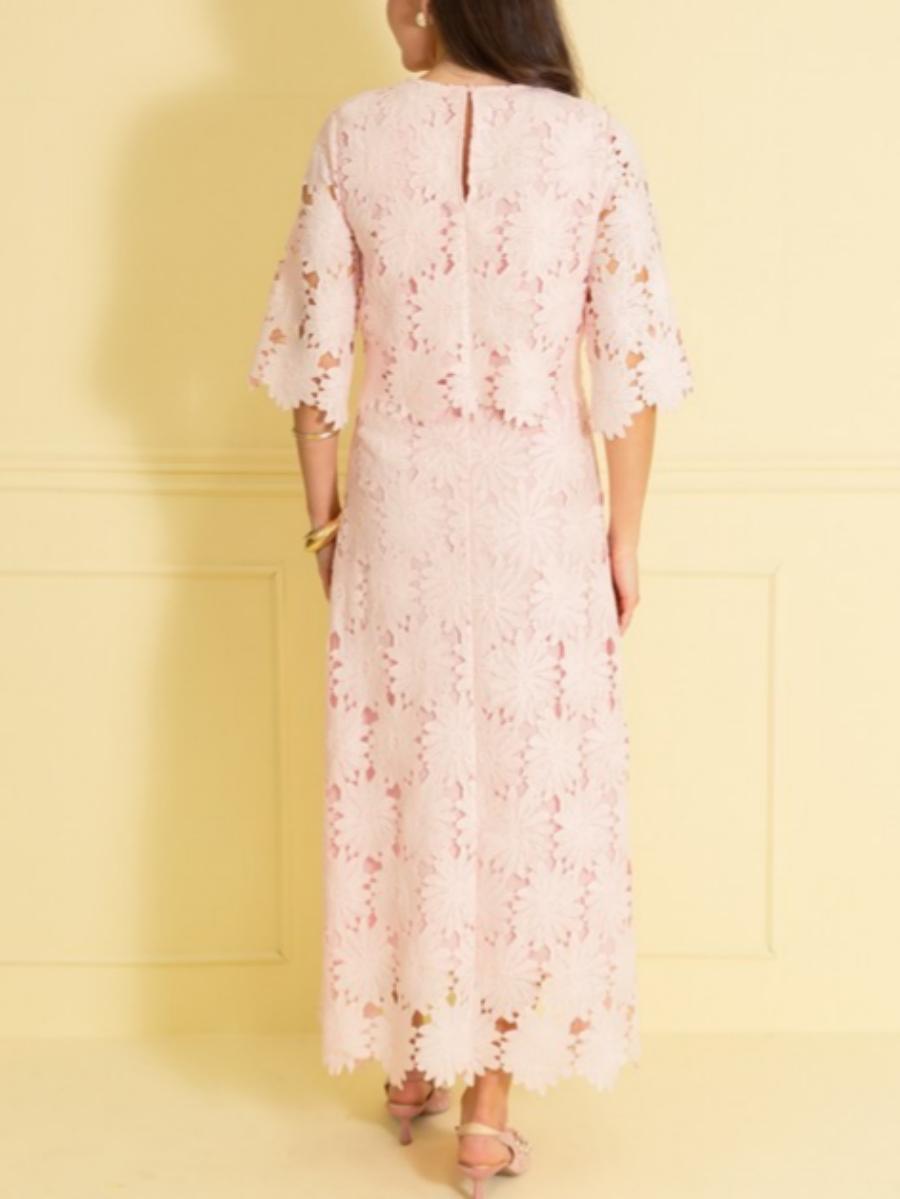 Delicate baby-pink lace blooms across a refined silhouette in the Gorgeous Lace Set—intricate floral motifs and openwork detailing give the ensemble a soft, airy texture while clean lines keep it modern and polished. Set includes matching top and skirt.